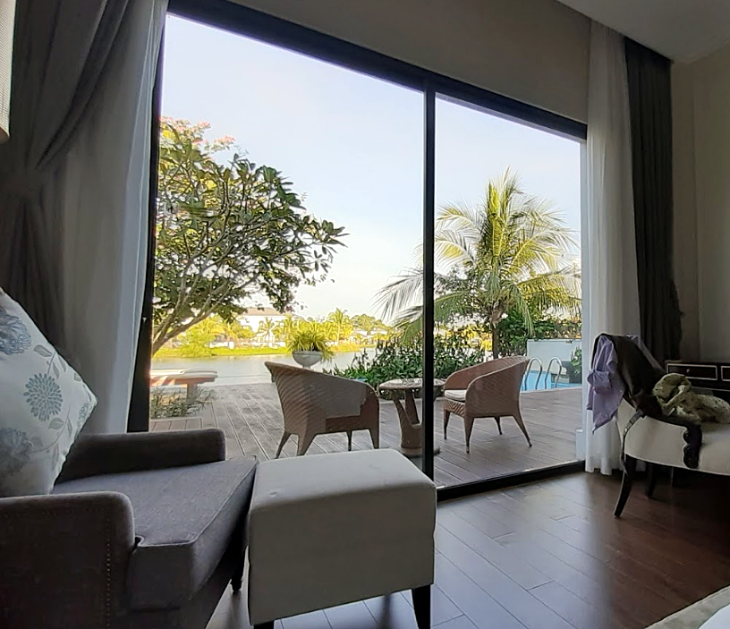 빈펄 디스커버리를 찾는 여행객들은 객실형 일반 호텔을 이용하기도 하지만 풀빌라를 이용하기 위해 찾는다고 해요. 복도를 지나 주방에서부터 거실 그리고 창밖으로 보이는 푸르른 강변과 풀빌라이기에 중요한 프라이빗 수영장의 전경을 볼 수 있어요. 빈펄 디스커버리 리조트는 푸꾸옥 시내와는 거리가 조금 있는 위치에 있어 풀보드를 선택하여 아침 점심 저녁을 모두 해결할 수 있어요.